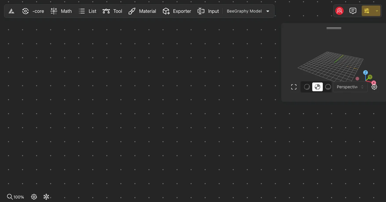 The workspace can be divided into several parts: in the upper left part, there is a tool panel, in the right part, there are tools related to users. In the lower left corner are the tools related to the Editor’s work and the button to change the scale. The 3D view mirroring window can be placed in any of the 4 corners. The main workspace is where the entire process of building the model using nodes will be performed.