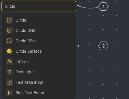 The corresponding nodes will appear in the lower section. Use the mouse scroll to navigate and select the desired node with a left-click. Once selected, the node will appear in the workspace.
