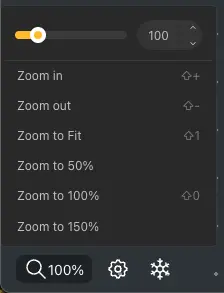 This feature enables users to adjust the scale using the mouse scroll button or the scale control button located in the left corner. Users can select the desired scale size. Additionally, the ’Zoom to Fit’ button zooms to a position where all nodes are visible.