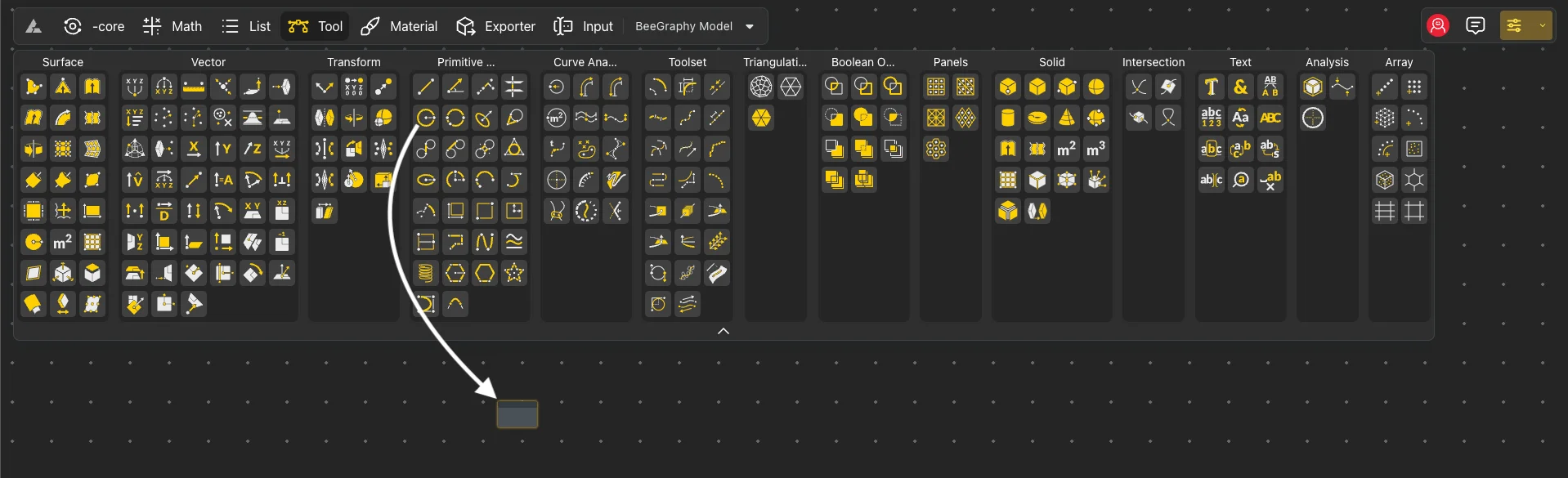 To add a node, find the desired node within its respective group, then click and drag the node’s geometry using the left mouse button to place it in the workspace.