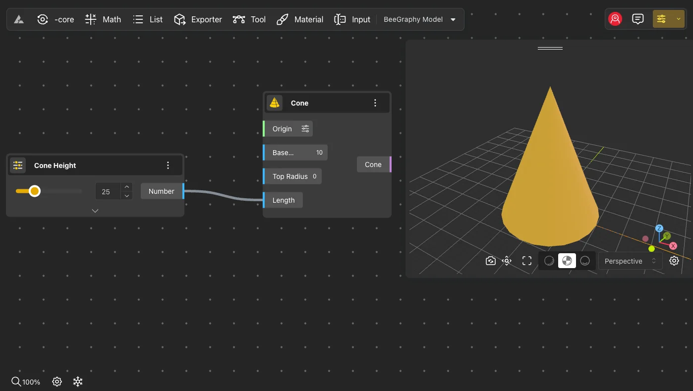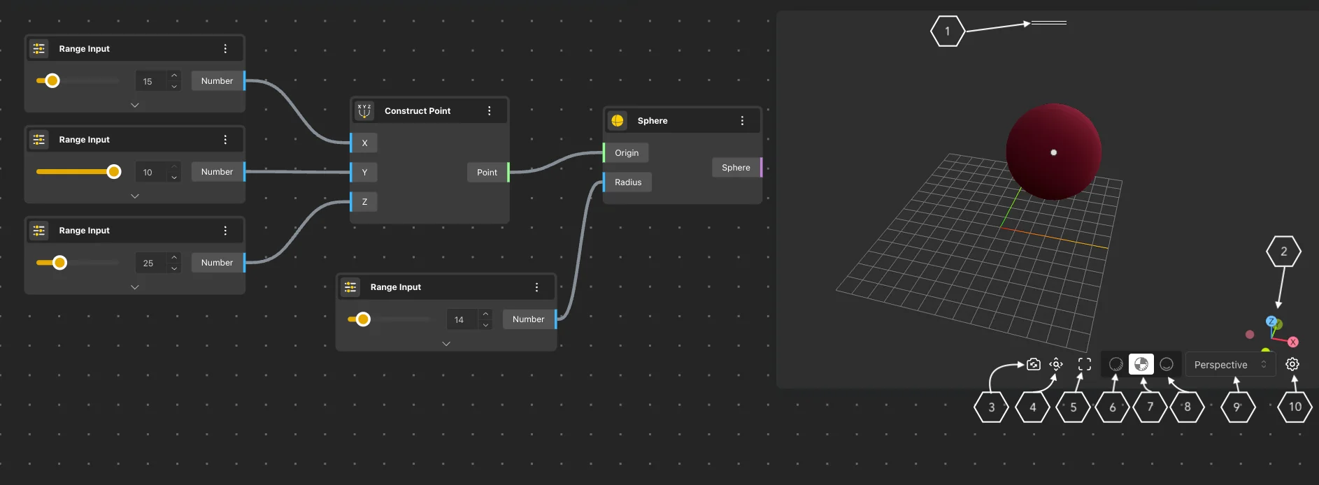 On the right side of the workspace is the 3D view, which can be adjusted by dragging any of the other three cells from the window’s transport zone (1) as desired. Here, you can observe the associated values of the nodes placed in the workspace, as well as the rendered output values displayed in 3D space.