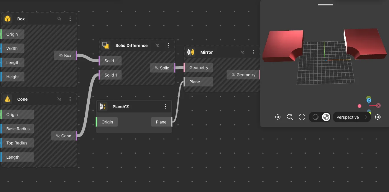The Mirror node creates a mirrored geometry of the input received from the input node, based on the specified plane.
