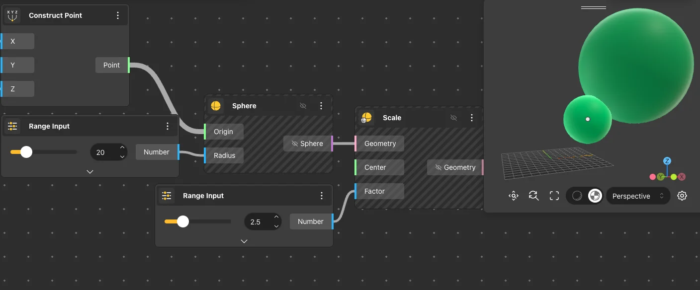 The Scale node returns the input geometry with a modified scale. It takes the point to scale from the input nodes.