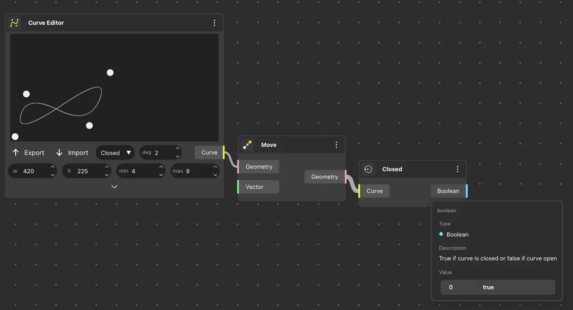 The Closed node returns a boolean value indicating whether the curve generated in the nodes is open or closed. It returns true if the curve is closed, and false otherwise.