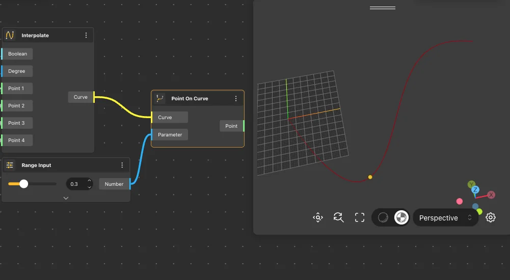 A Point On Curve node takes a curve and parameter(s) as input and returns the item(s) corresponding to the parameter.