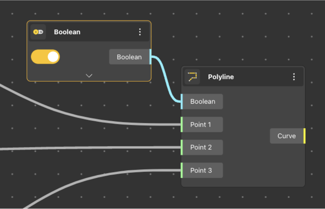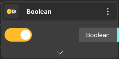 The Boolean node outputs a ’true’ or ’false’ value, returning ’true’ when the switch is on and ’false’ otherwise.