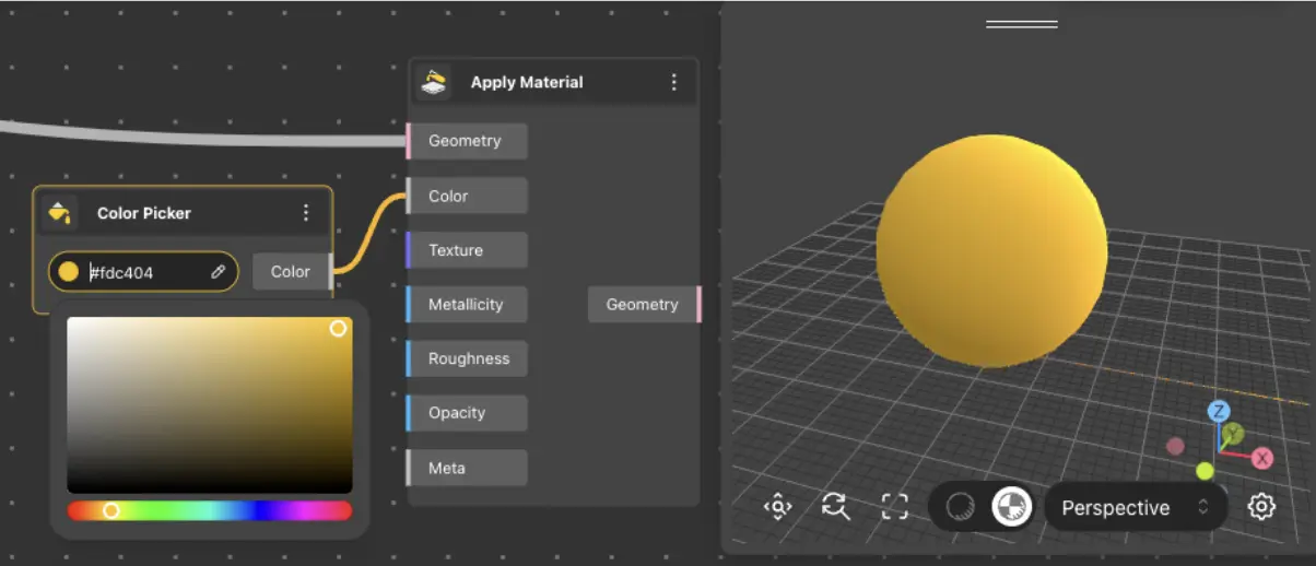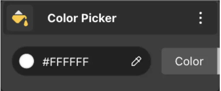 The Color Picker node provides the selected color value. Colors can be imported either via the Hex code or by selecting them from the pop-up window.