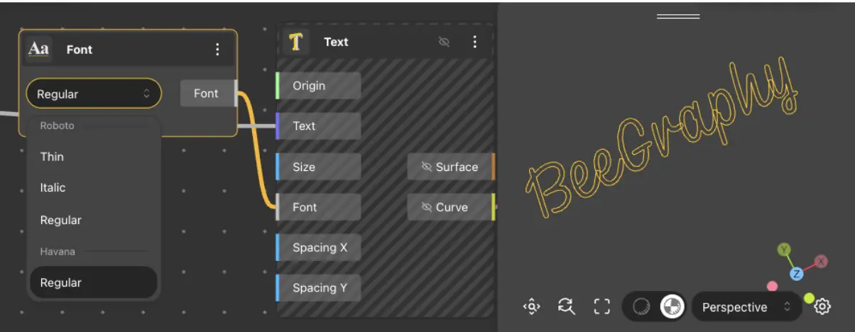 The Font node is used to select fonts for text manipulation. Fonts need to be pre-uploaded in the Node Editor’s Assets section under the Fonts category using the Upload button.