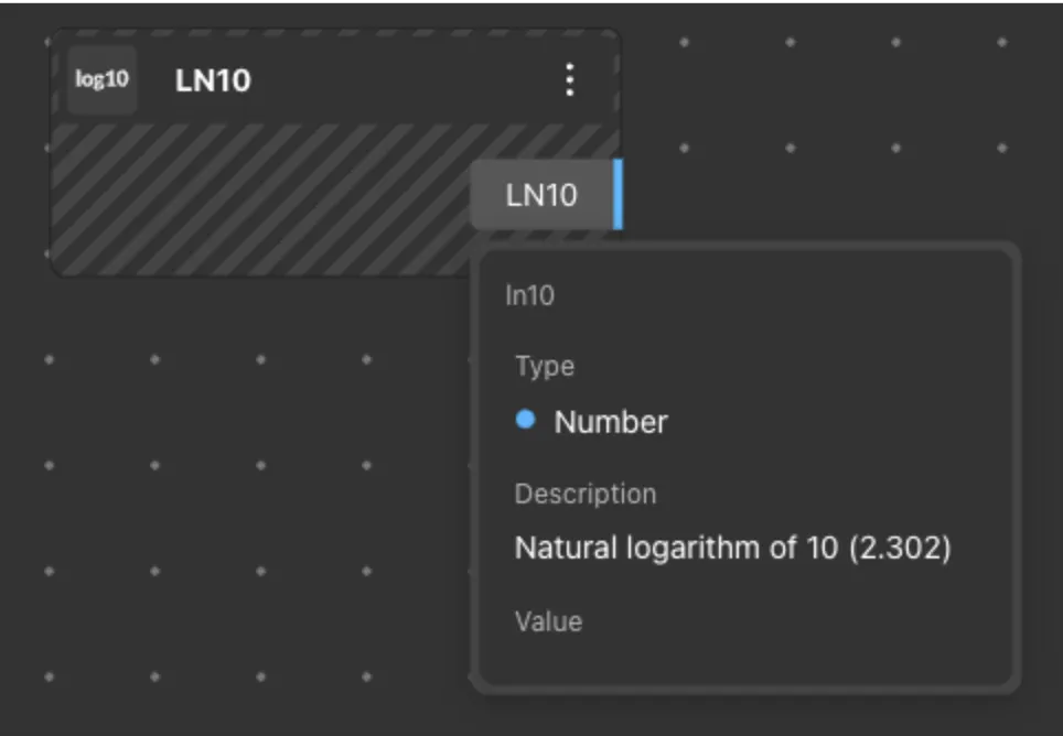The LN10 node returns the logarithm of 10 to the base of the natural number e.