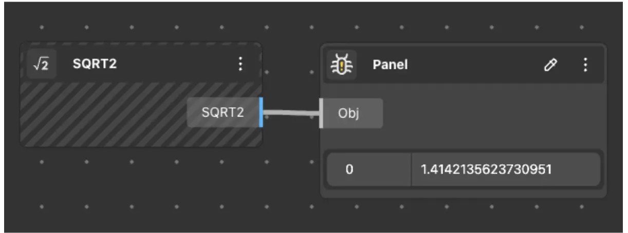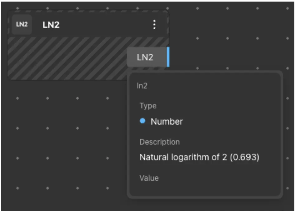 The LN2 node returns the natural logarithm of the constant e, divided by the natural logarithm of the number 2.