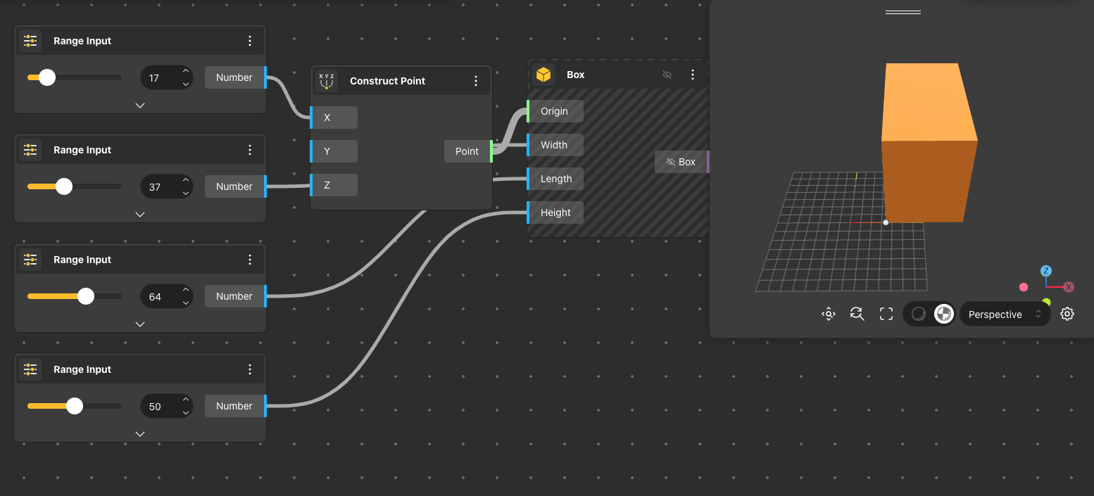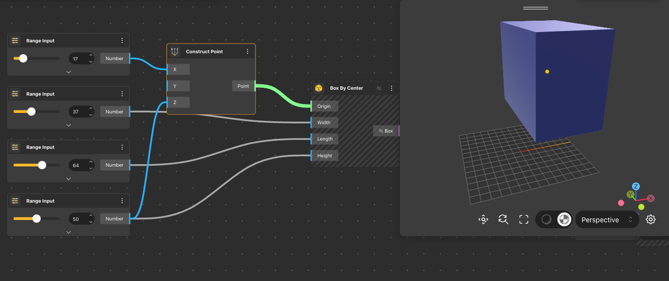 The Box node returns a cube that is constructed using the center, length, width, and height received in the input node.
