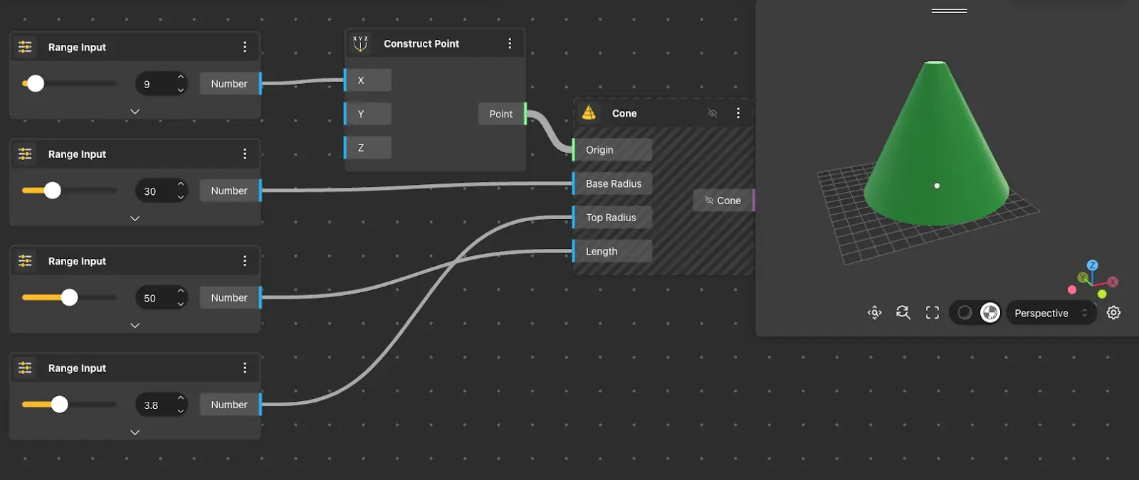 The Cone node returns a cone that is constructed using the base center, bottom and top radii, and height received in the input node.