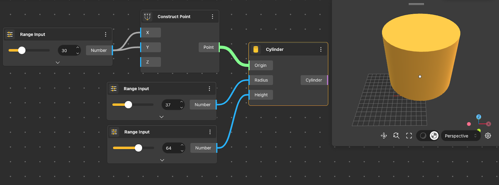 The Cylinder node returns a cylinder using the base center, radius, and height provided in the input.