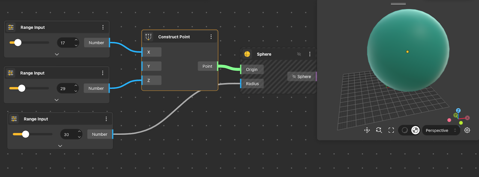 The Sphere node returns a sphere that is constructed using the center and radius received in the input node.