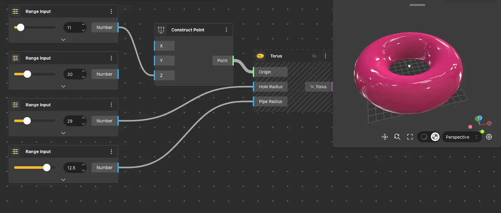 A torus is a solid formed by rotating a circle in three-dimensional space one complete revolution around an axis. The center of the torus, the aperture radius, and the radius of the circle can be controlled.